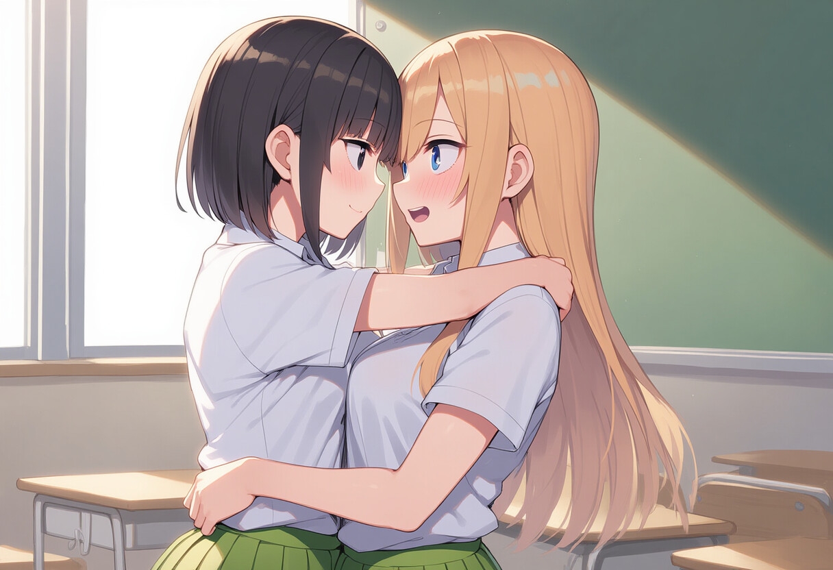 教室での制服プレイに始まり、今までの想いを取り返すべく百合セックスしまくる二人。
